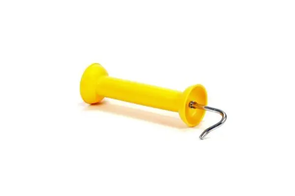 Poortgreep voor het eenvoudig en veilig openen en sluiten van een electrische schrikafrastering. De poortgreep heeft een opvallende gele kleur en is geschikt voor zowel schrikdraad, schrikkoord als schriklint.