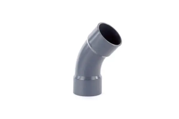 Druk PVC bocht van 45 graden welke op een PVC buis van 250 mm past. De bocht is aan beide zijden voorzien van een lijmmof. De 45 graden bocht voldoet aan drukklasse PN12.5.