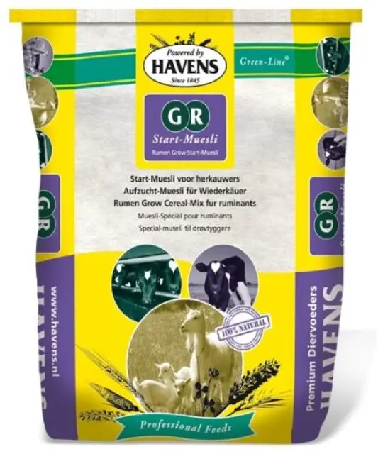 De GR-Opstart-Muesli is een structuurrijke voeding die de penswerking van jonge geiten stimuleert bij het overschakelen van melk op krachtvoer. Hoe beter de pens ontwikkeld is, hoe minder problemen (zoals diarree en longontstekingen) zich over het algemeen voordoen bij het spenen.