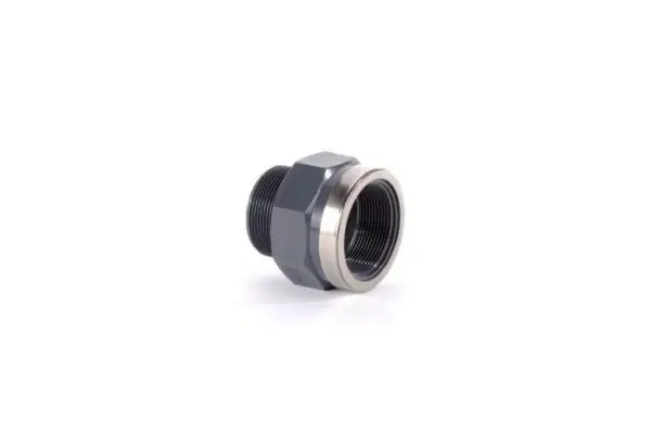 PVC schroefmof met een buitendraad en een binnendraad. De schroefmof is aan één zijde voorzien van een 1 1/2″ buitendraad en aan de andere zijde van een 1 1/2″ binnendraad met verstevigingsring. De schroefmof met verstevigingsring voldoet aan drukklasse PN16.